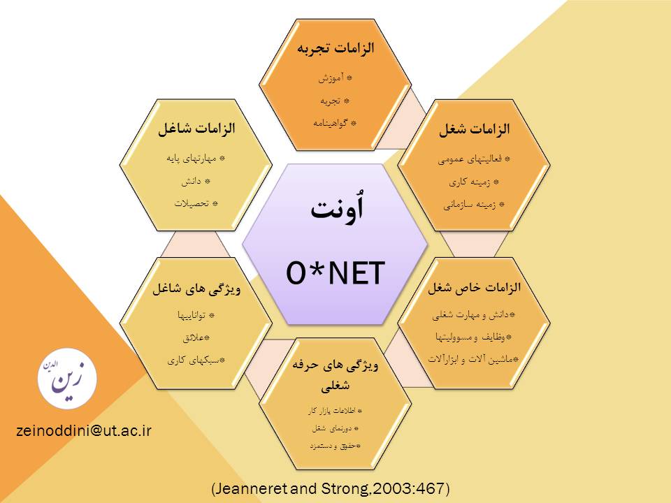 اُونت به زباني طراحي شده است كه همه كاربراني كه در جستجوي اطلاعات مربوط به مشاغل اند، بتوانند از آن استفاده كنند.(U.S. Department of Labor, 1993, 6) بنابراين ميتوان از آن به عنوان الگويي مناسب براي تجزيه و تحليل مشاغل متعدد در سازمانها استفاده نمود و مبناي معناداري براي كارشناسان حوزه منابع انساني باشد.
